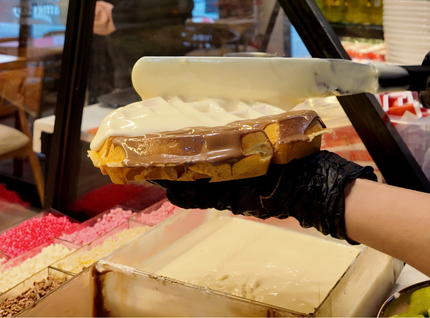 Sütlü beyaz çikolata, muz, kivi, çilek, karışık damla çikolata, fındık, sütlü çikolata, dondurma (çikolata sos, draje, kuruyemiş ve meyve ile servis edilir.)